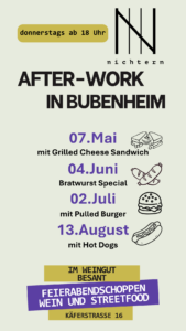 Die Initiative zur Förderung der Dorfgemeinschaft lädt zum Feierabendschoppen am Bürgerhaus ein und wir sind mir unserem Weinstand dieses mal vertreten.